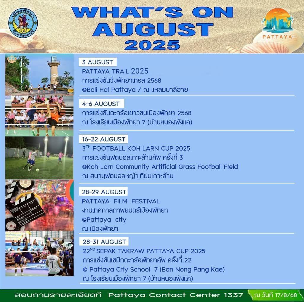 本月的压轴大戏是22年芭堤雅杯藤球赛,第2025届藤球赛将于28月31日至7日在芭堤雅市第七中学(Ban Nong Pang Kae)举行,届时将上演精彩纷呈的传统体育赛事。更多详情,请致电芭堤雅联络中心1337。